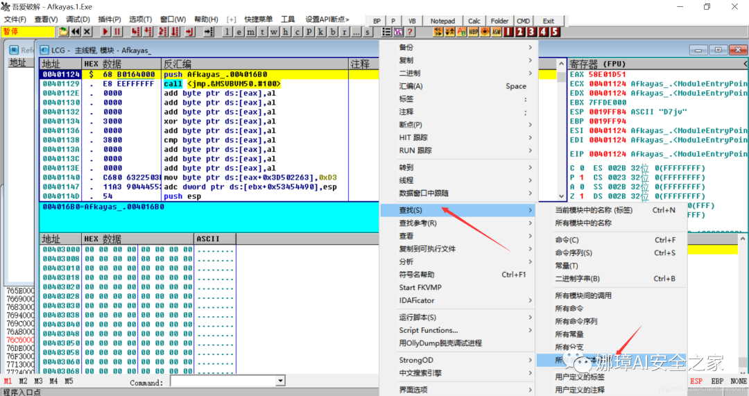 第二步:OllyDbg工具打开Afkayas.1.EXE文件如下图所示。