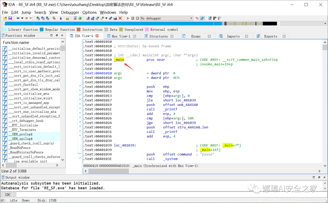 找到main函数,然后点击“_main”位置高亮显示。