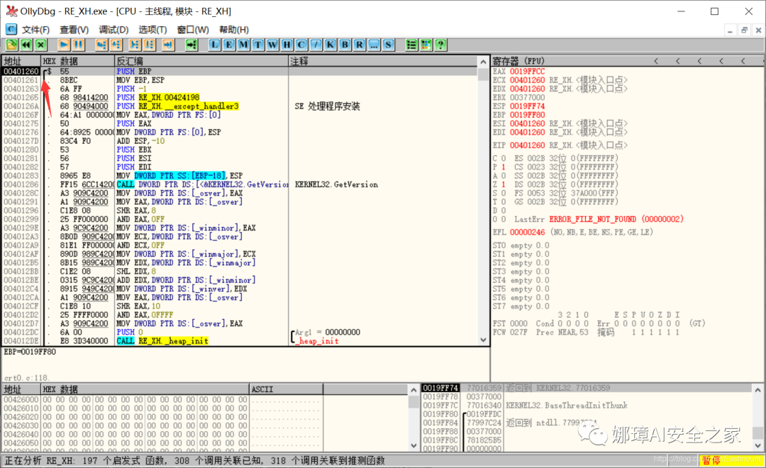 第二步,通过OD打开运行的EXE程序“RE_XH.exe”。