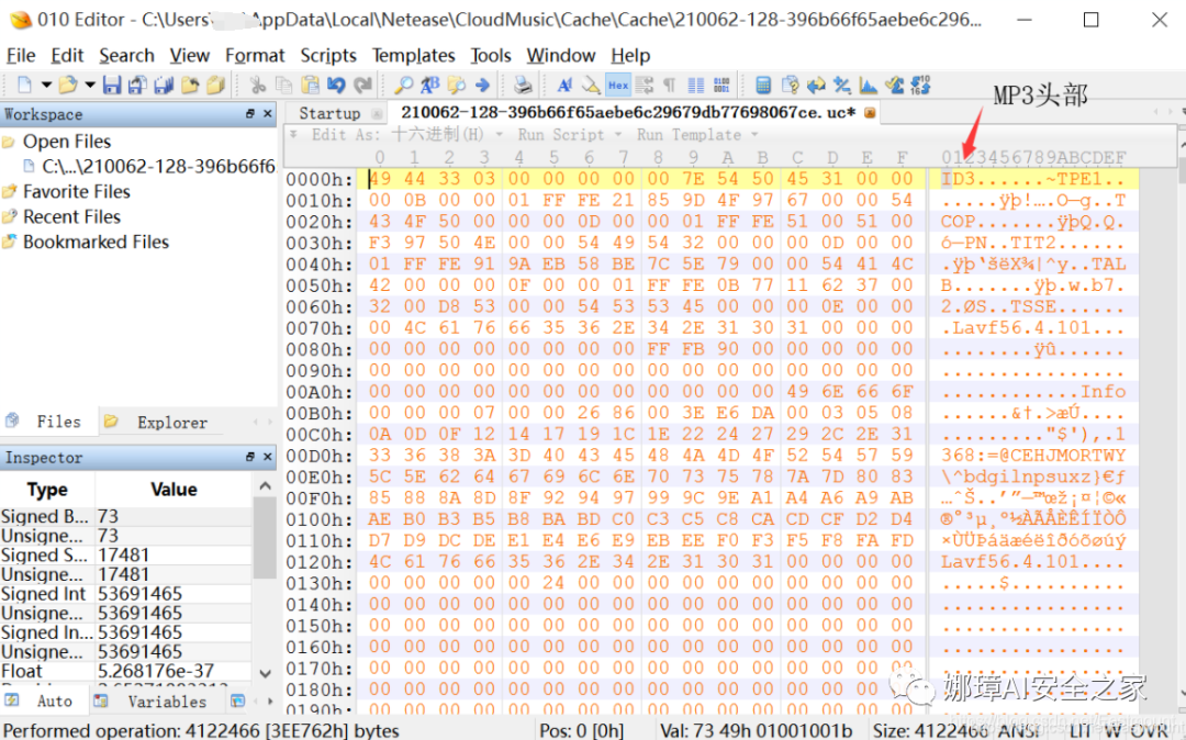 第四步,接着再将文件拖动到010 Editor软件,如下图所示:它是一个加密文件,最多的数据是A3,猜测其是加密后的无意义0(逆向熟练后的感觉),通常音频的加密方式不会太复杂,而最简单的异或加密(可逆)。