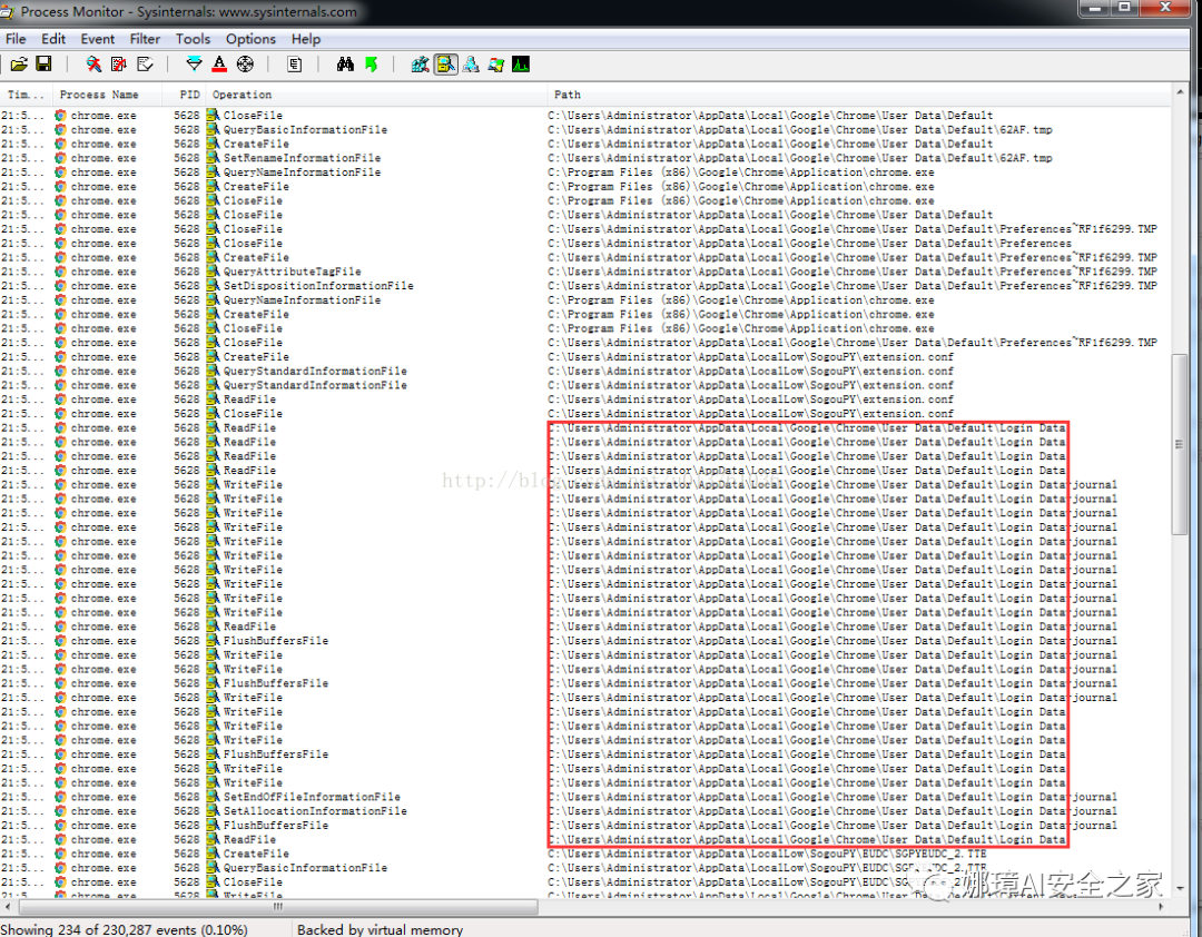这个时候需要开启监控工具Process Monitor(后续文章会详细介绍),查看打开注册表和文件操作信息。然后到chrome密码管理界面,随便删除一条记录,然后看看chrome本身对哪些文件或者注册表进行了修改。推荐TK13大神文章: