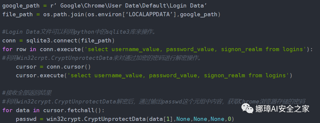 下面通过Python代码实现从环境变量中读取Login Data文件的数据,再获取用户名和密码,并将接收的结果通过win32crypt. CryptUnprotectData解密密码。