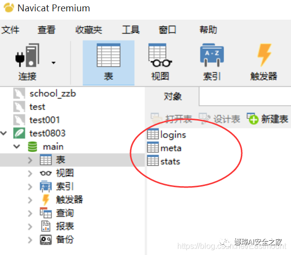 第六步,打开之后在“main”数据库中包含了三张表,其中logins为登录表。