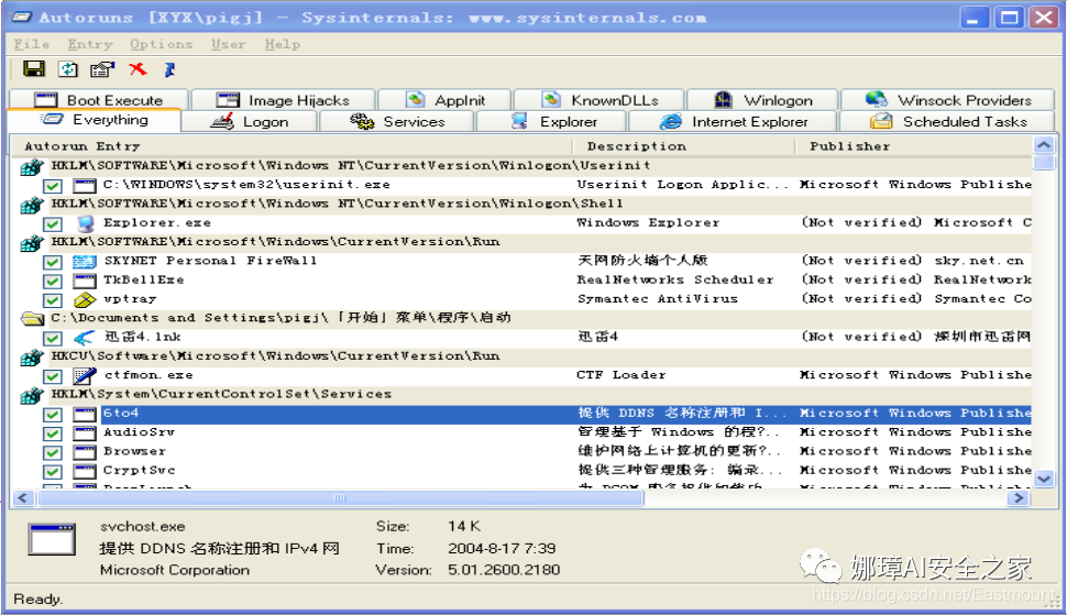 下图展示了Autoruns软件看到Windows操作系统进行自启动的选项。如果病毒本身能很好地结合这套机制,它可以做的事情非常多,并且具有很好的隐蔽性,比如前面分析的熊猫烧香病毒。