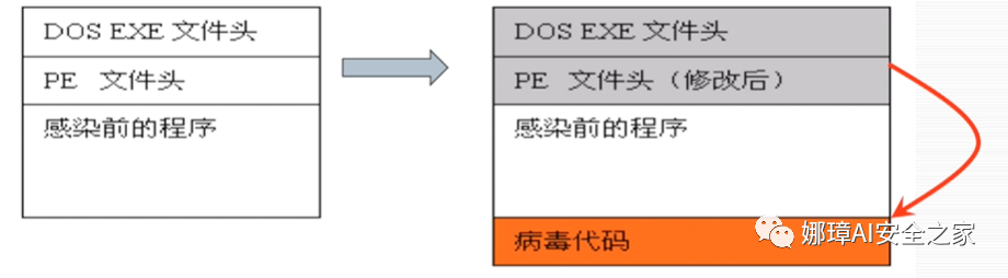 当了解PE文件格式之后,要了解PE文件感染型病毒就非常容易了。如下图所示,左边是一个正常的PE文件,右边是PE病毒感染该程序时的修改,可以看到病毒代码在最后面,通常它是一种新节的形式。我们知道PE文件是由多个节组成的,病毒代码为了融入目标程序会以节的形式,同时修改PE文件头。
