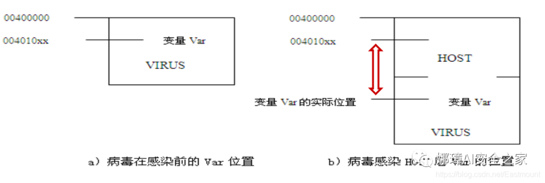 下图展示了病毒代码自我重定位的过程。