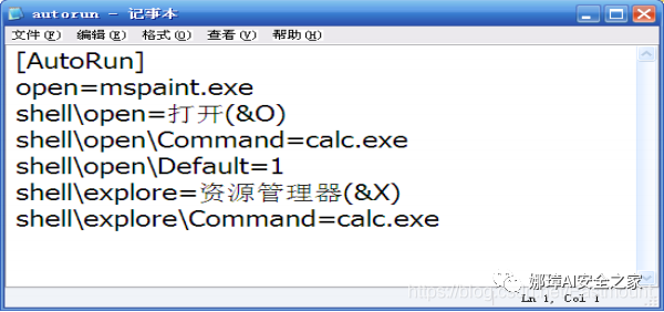 再补充一个通过可移动存储设备传播的非感染式病毒,即Autorun.inf。右图显示了Autorun.inf文件,如果文件存在U盘根目录,当我们双击这个U盘时,它就会触发对应的病毒,如果选择U盘盘符右键打开或打开资源管理器,这是进入的也是病毒程序。当然下面的演示是计算器程序。