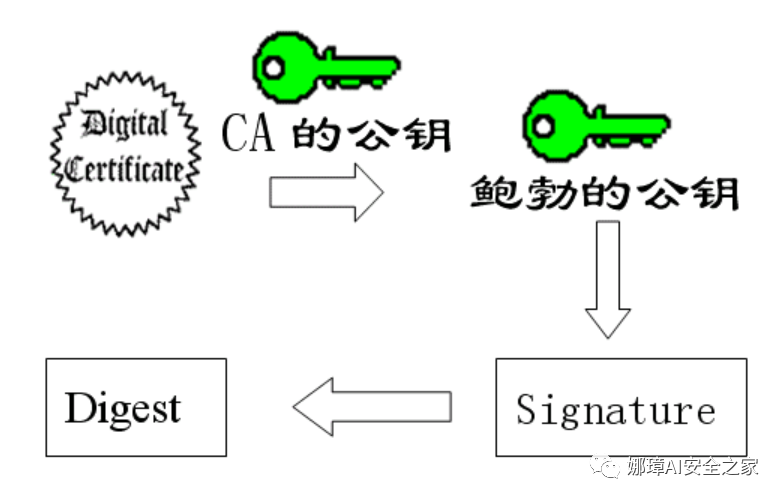 (13) 苏珊收信后,用CA的公钥解开数字证书,就可以拿到鲍勃真实的公钥了,然后就能证明"数字签名"是否真的是鲍勃签的。