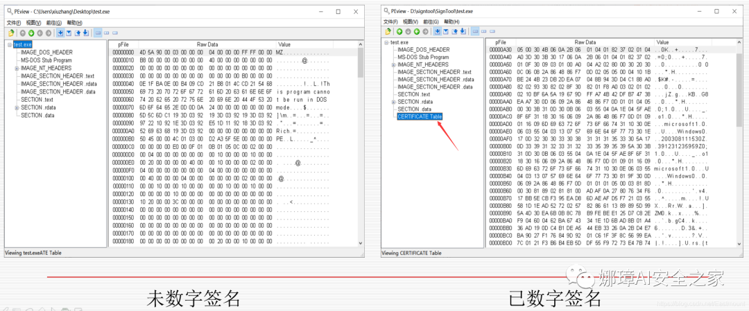 使用PEView查看签名前后对比图,可以看到Certificate Table存储相关签名信息。