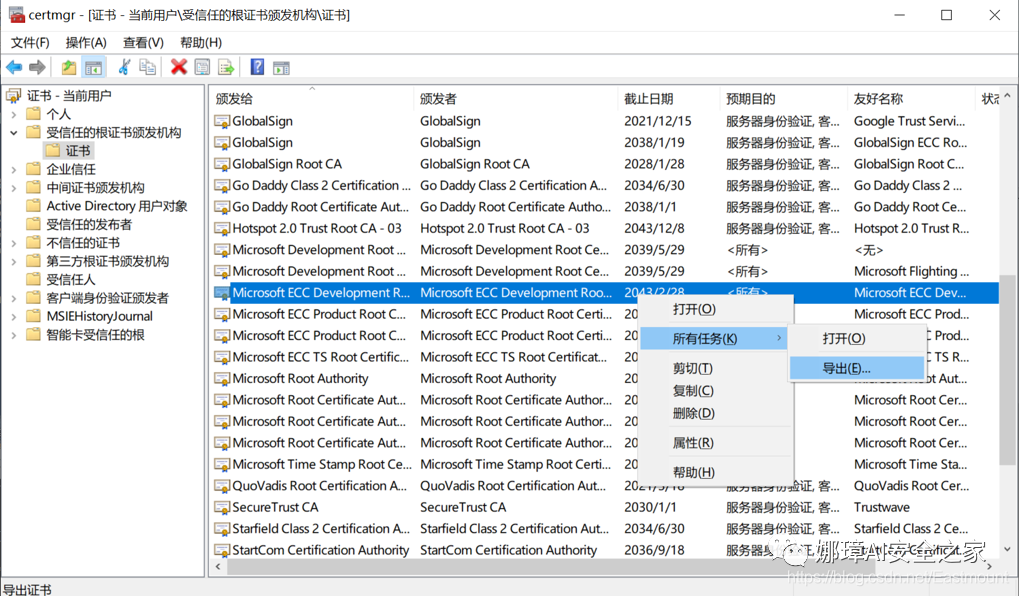 我们随意导出其中一个根证书,导出直接选择Base64编码那个就行。