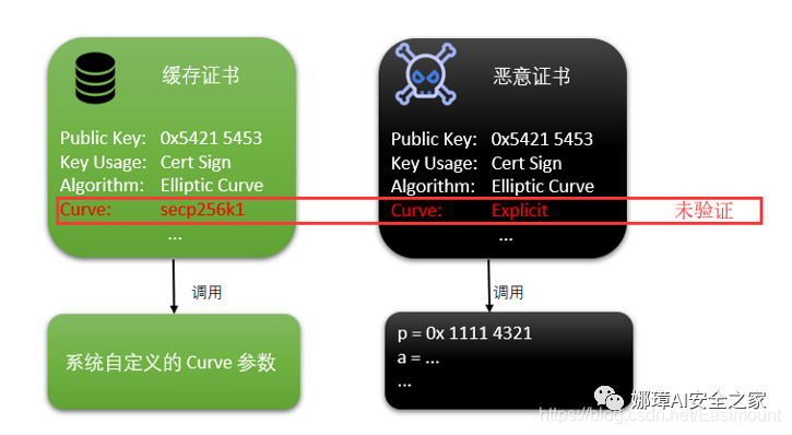 伪造的恶意证书与Windows系统中的缓存证书有同样的公钥,但Curve项没有在校验范围内,所以可以通过构造自定义Curve来伪造证书。使得证书验证流程依然成立,但通过验证的证书已经不是之前成功验证的安全证书。