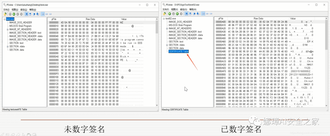 第五步,我们采用PEView打开已签名和未签名的PE文件对比,发现CERTIFICATE Table区域为前面信息。
