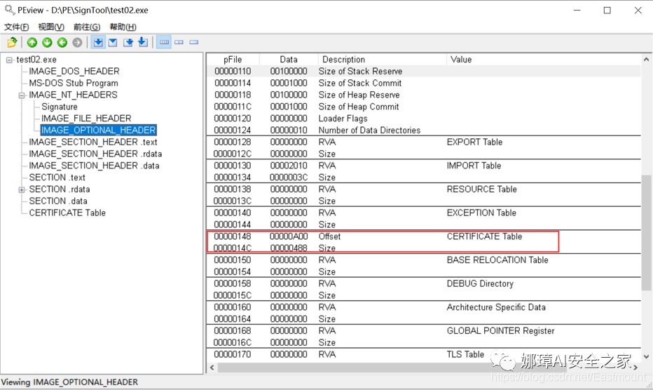 第一步,使用PEView查看签名的test02.exe文件,可以看到Certificate Table存储相关签名信息。
