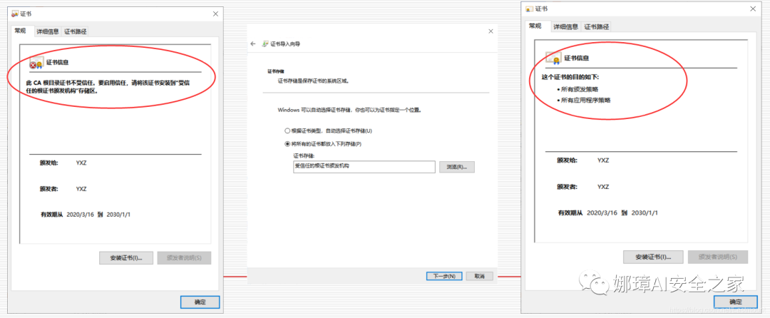 第二步,双击test.cer点击“安装证书”,并设置信任根证书机构。