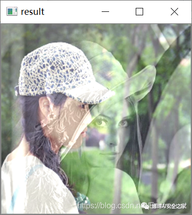 输出结果如图所示,它将src1图像和src2图像按比例系数进行了融合,生成目标结果图result。