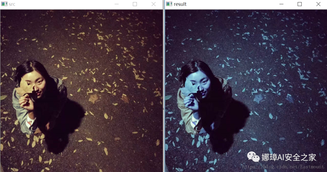 输出如图所示,左边为原始图像,右边为像素值减少50像素后的图像,输出图像显示更偏暗。