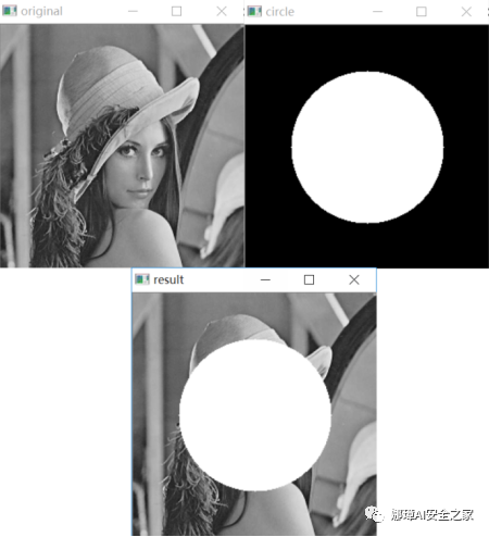 输出如图所示,原始图像与圆形进行或运算之后,提取了图像除中心原形之外的像素值。