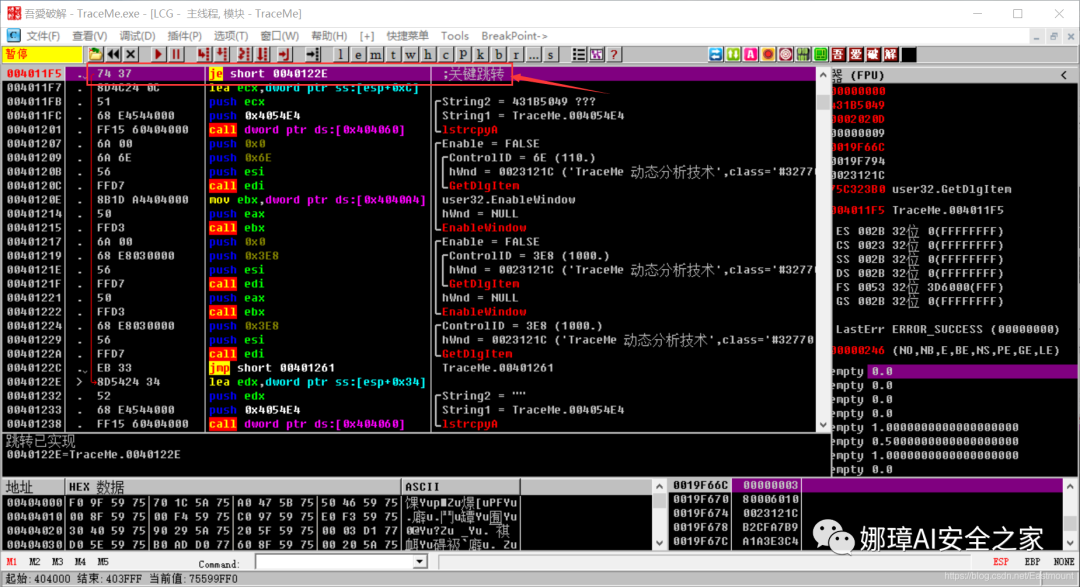 继续按下F9运行程序跳转到我们刚刚下断点的“关键跳转”位置。