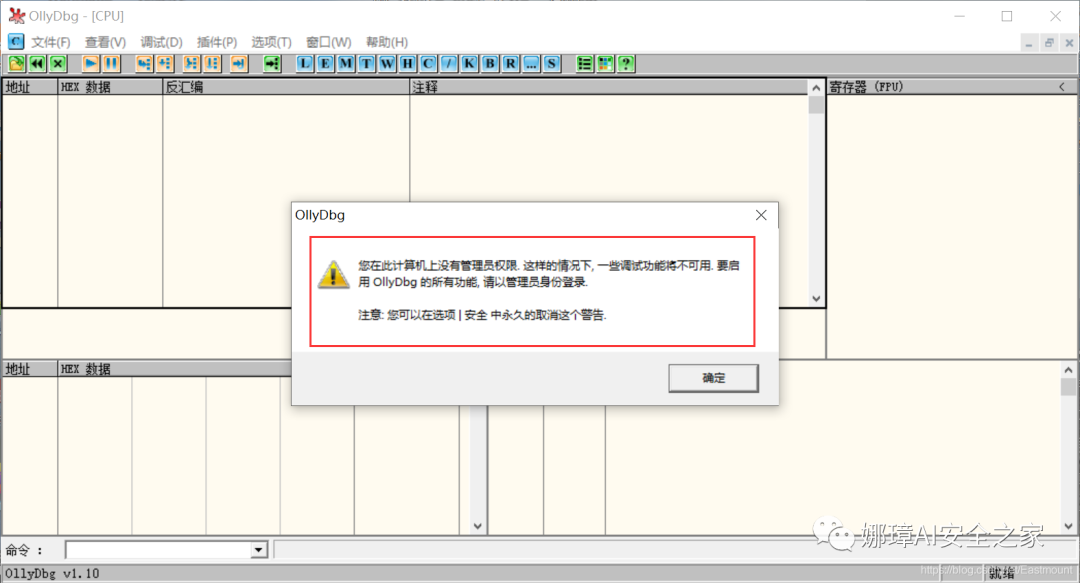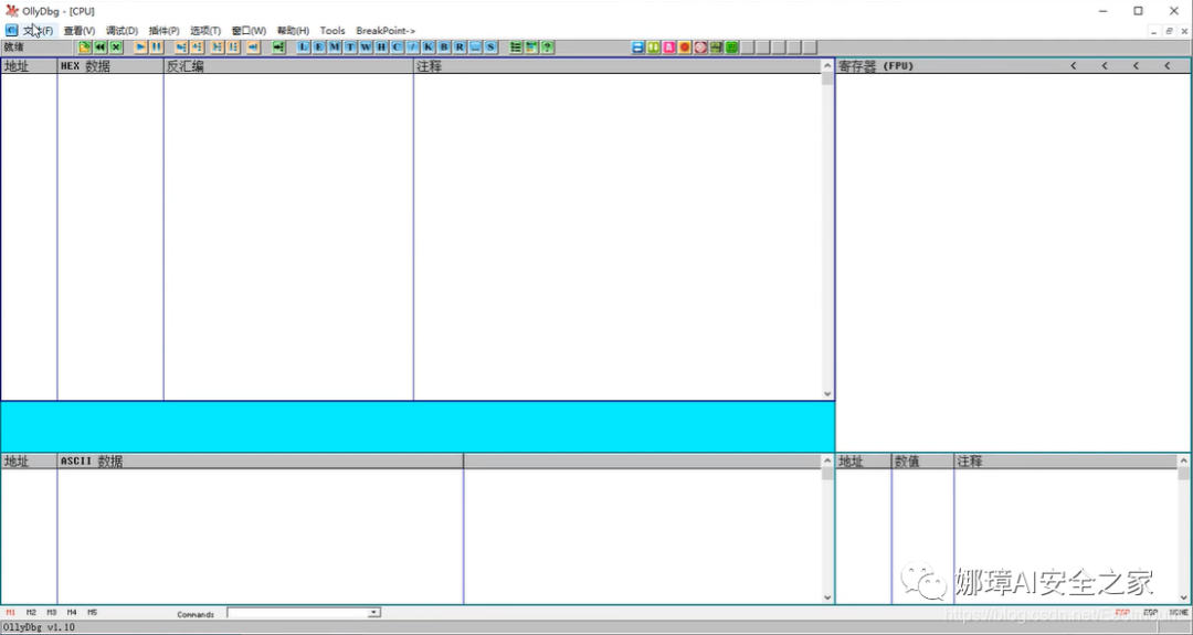OllyDbg是逆向分析常用的调试工具,打开主界面如下图所示,包括反汇编窗口、寄存器窗口、信息窗口、数据窗口、堆栈窗口。