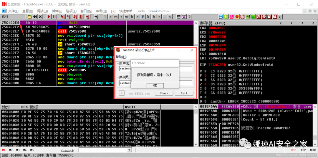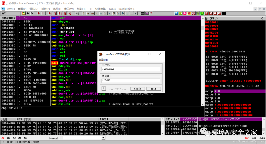 继续往下走,来到0x004011E4位置,我们可以看到右上角EDX和EAX的值就是我们输入的“eastmount”和“123456”。同时,右下角显示两个值都已经压到栈里面了。