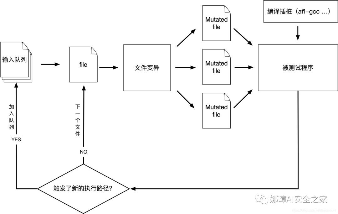 AFL(American Fuzzy Lop)是由安全研究员Michał Zalewski(@lcamtuf)开发的一款基于覆盖引导(Coverage-guided)的模糊测试工具,它通过记录输入样本的代码覆盖率,从而调整输入样本以提高覆盖率,增加发现漏洞的概率。其工作流程大致如下: