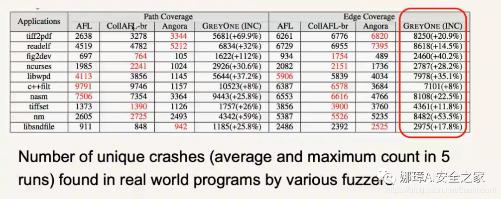 接着我们看看实验结果,我们和AFL、CollAFL、Angora进行了对比,我们比它们中最好的代码覆盖率也提升了20%左右。