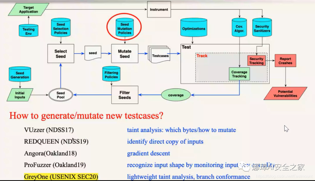 第一块是初始种子,它对Fuzzing的效率还是有很大影响的。如果你不给初始种子,它也会去测试,但是其效率比较低,很多学者去研究如何给一个好的初始种子,让Fuzzing更快地进入状态,更好地找到漏洞。