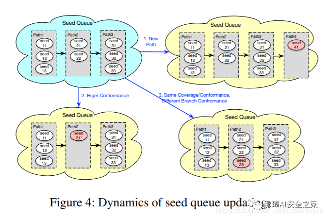 如果没有新的代码覆盖率(Same coverage,higher path conformance),它的代码覆盖率与之前某组测试例是一样的,但是它的路径匹配度更好,那我就取代了刚才的两个测试例。如下图左下角部分,种子编号21。