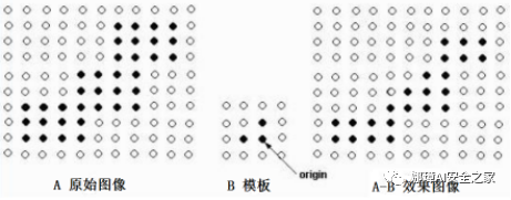 被扫描到的原始图像中的像素点,只有当卷积核对应的元素值均为1时,其值才为1,否则其值修改为0。换句话说,遍历到的黄色点位置,其周围全部是白色,保留白色,否则变为黑色,图像腐蚀变小。