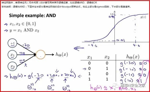 可以看到x1和x2变量作为神经网络的输入,当它们取不同的0或1值时,其结果通过sigmod函数计算的值是不同的。它模拟了整个AND运算。