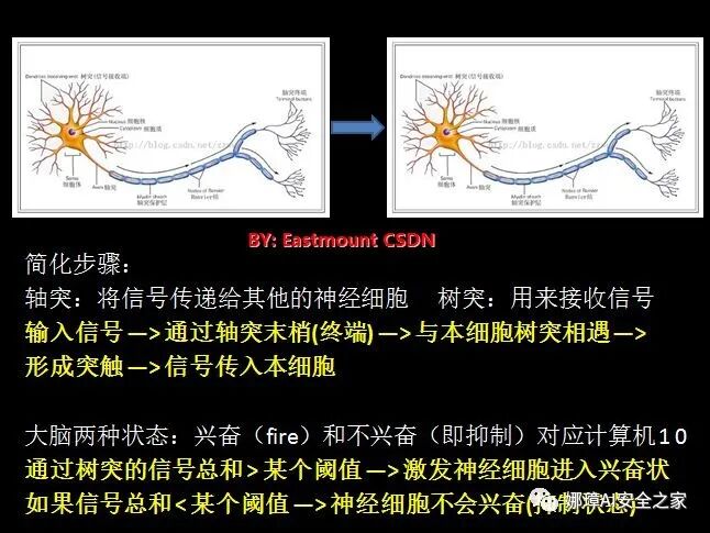 神经细胞利用一种我们还不知道的方法,把所有从树突突触上进来的信号进行相加,如果全部信号的总和超过某个阈值,就会激发神经细胞进入兴奋(fire)状态,这时就会有一个电信号通过轴突发送出去给其他神经细胞。如果信号总和没有达到阈值,神经细胞就不会兴奋起来。这样的解释有点过分简单化,但已能满足我们的目的。
