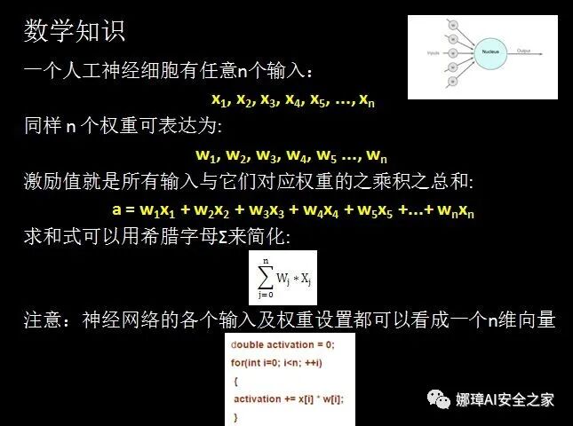 当输入信号进入神经细胞时,它们的值将与它们对应的权重相乘,作为图中大圆的输入。如果激励值超过某个阀值(假设阀值为1.0),就会产生一个值为1的信号输出;如果激励值小于阀值1.0,则输出一个0。这是人工神经细胞激励函数的一种最简单的类型。涉及的数学知识如下图所示: