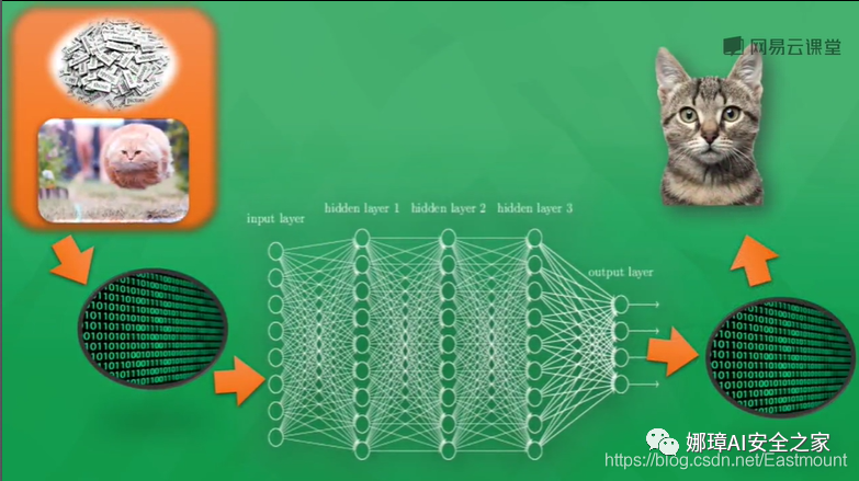 如下图所示,通常来说,计算机处理的东西和人类有所不同,无论是声音、图片还是文字,它们都只能以数字0或1出现在计算机神经网络里。神经网络看到的图片其实都是一堆数字,对数字的加工处理最终生成另一堆数字,并且具有一定认知上的意义,通过一点点的处理能够得知计算机到底判断这张图片是猫还是狗。