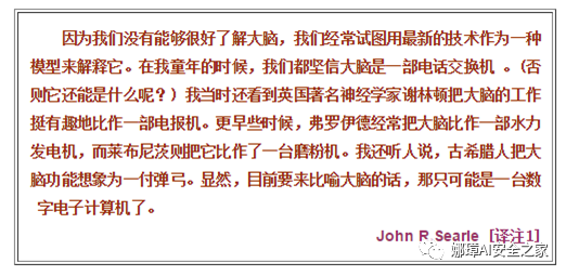 信号在大脑中实际怎样传输是一个相当复杂的过程,但就我们而言,重要的是把它看成和现代的计算机一样,利用一系列的0和1来进行操作。就是说,大脑的神经细胞也只有两种状态:兴奋(fire)和不兴奋(即抑制)。