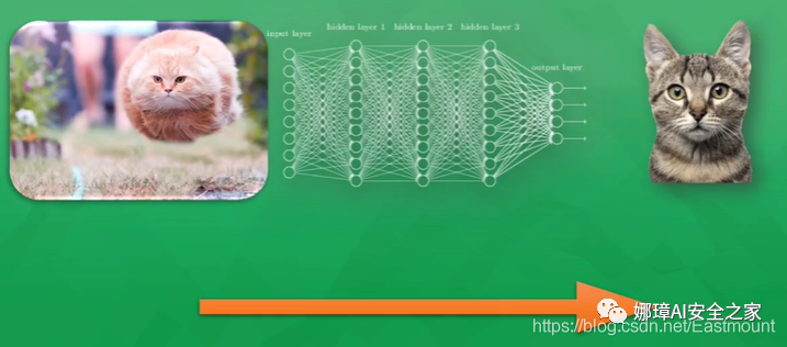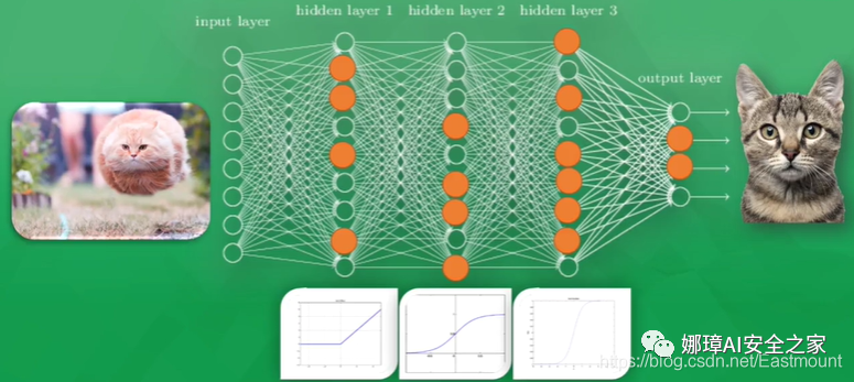 如果预测的结果是一只狗,所有神经元的参数就会被调整,这时有一些容易被激活的神经元就会变得迟钝,而另一些会变得敏感起来,这就说明了所有神经元参数正在被修改,变得对图片真正重要的信息敏感,从而被改动的参数就能渐渐预测出正确的答案,它就是一只猫。这就是神经网络的加工过程。