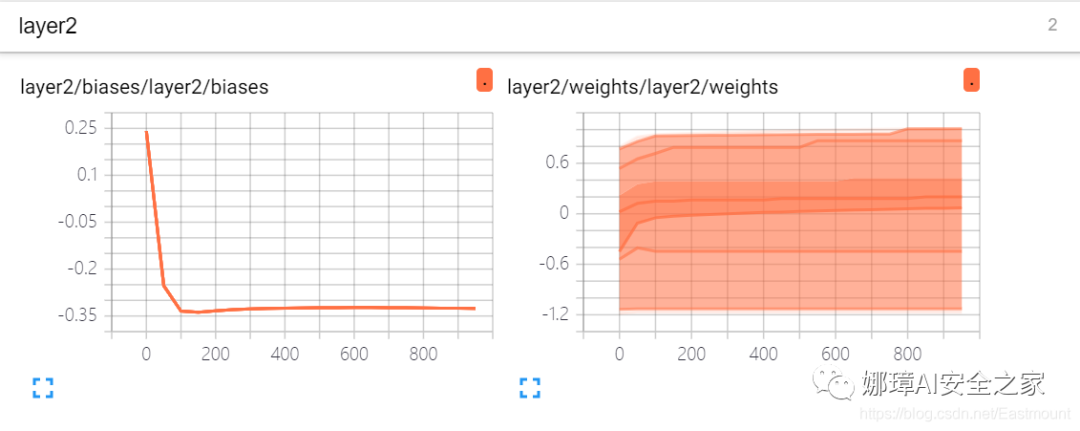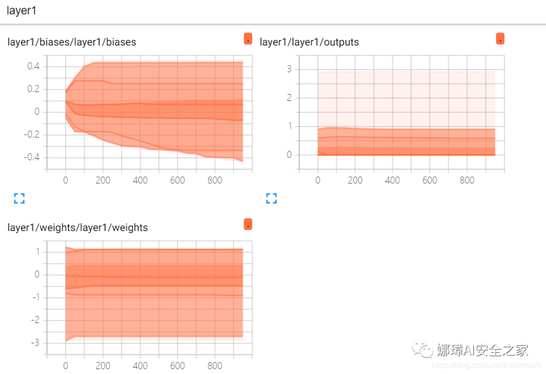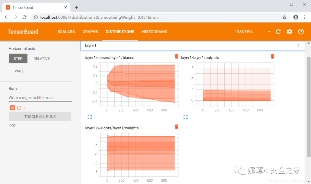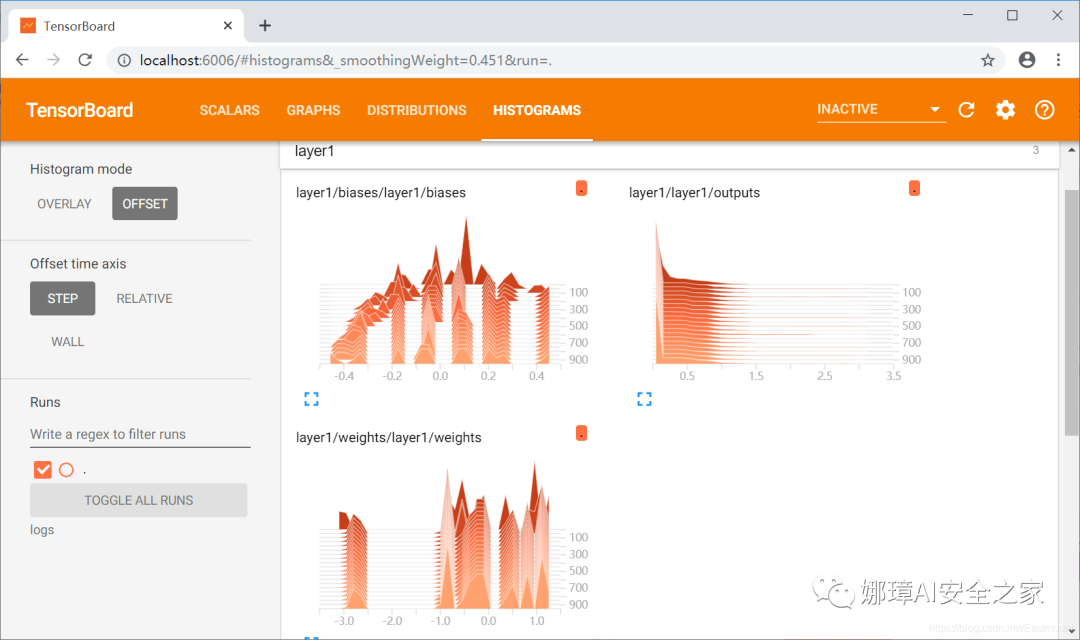 4.通过tf.summary.histogram()函数定义图形的左上角名称,包括weights、biases、outputs。部分TensorFlow的版本是调用tf.histogram_summary()函数。