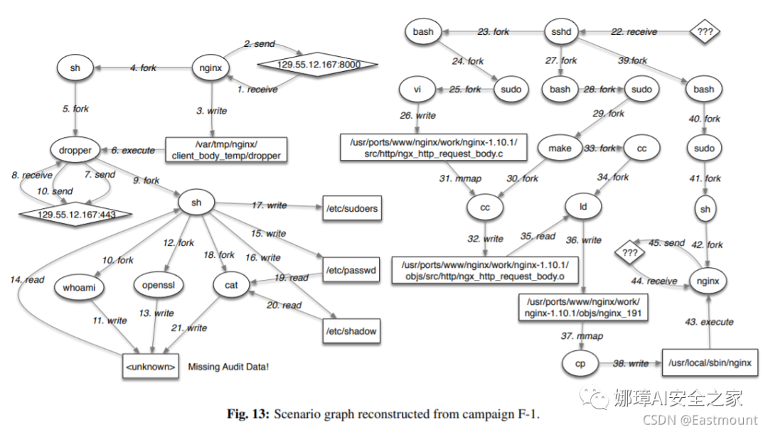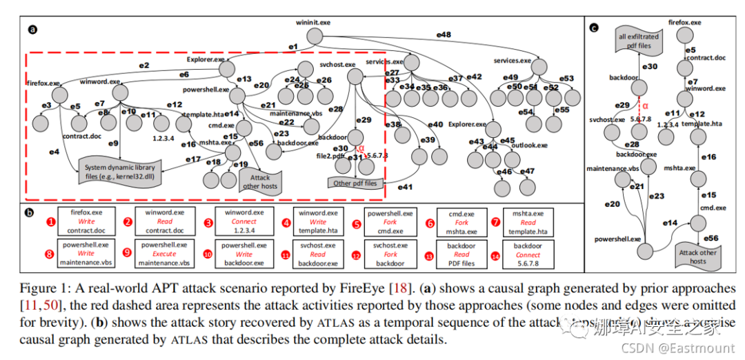 (1) 该图右边部分是上篇论文的基本流程,即从三个操作系统(BSD、Linux、Windows)审计日志信息中构建 溯源图(Provenance Graph),然后还原攻击场景
