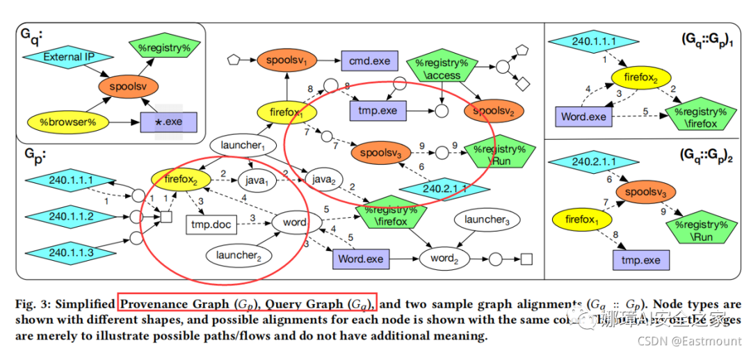 (2) 左边引入了外部IOC关系信息,提取并构建攻击行为的查询图(Query Graph),这里引入了图对齐或图匹配
