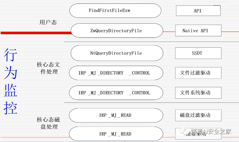 行为监控可以从用户态到核心态文件处理,再到核心态磁盘处理,有一系列的函数进行Hooking和InlineHooking进行整体的行为监控