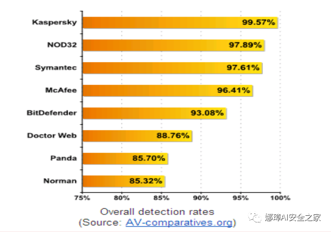 下面展示了相应的安全软件进行“启发式扫描+特征值扫描”的检测率。比如,卡巴斯基能达到99.57%,