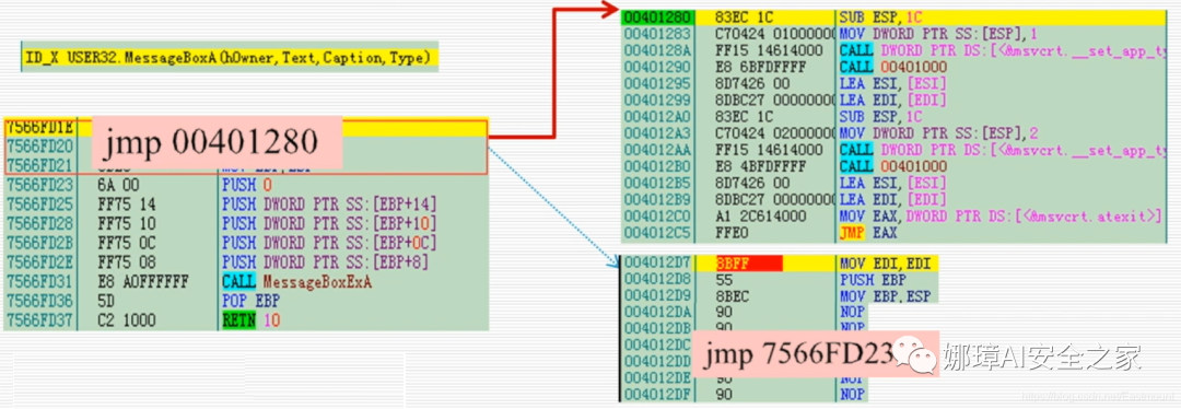 首先将MessageBox头部的5个字节Move到准备好的位置,其次把MessageBox的头部5个字节给一个jmp,跳转到自定义的MessageBox上(00401280)。