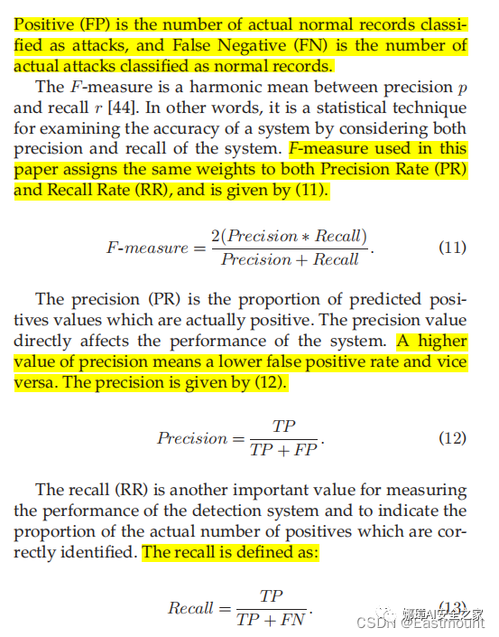 该部分介绍模型的评估指标,常见的包括准确率、召回率、精确率、F值、误报率等。