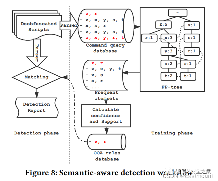 解混淆完成之后,我们也提供了一个检测系统。关键是训练、检测之前,进行解混淆操作,我们使用比较基础的OOA方法,通过挖掘平凡子集,提取一些可以用于检测的规则。