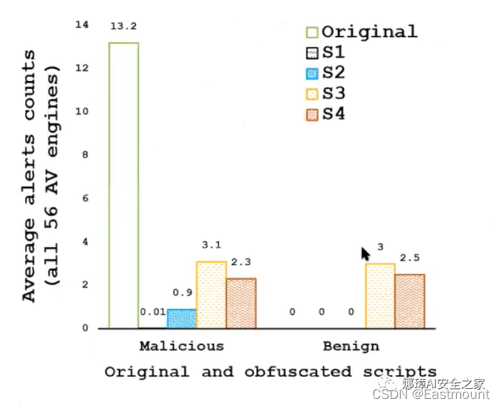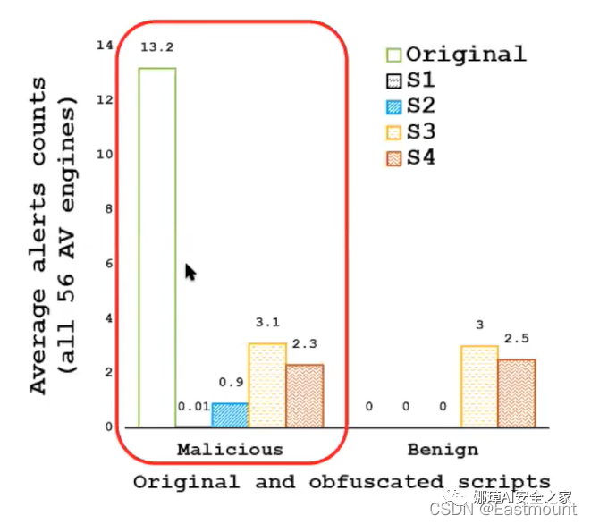 由图可知,对于恶意样本来说,原始样本平均被13个引擎所查杀,但进行混淆后,检测率大幅度下降。这里有2至3个可以固定将编码混淆找出,但存在一个问题,它其实检测的是编码混淆方法,而不是恶意性,从而带来误报。