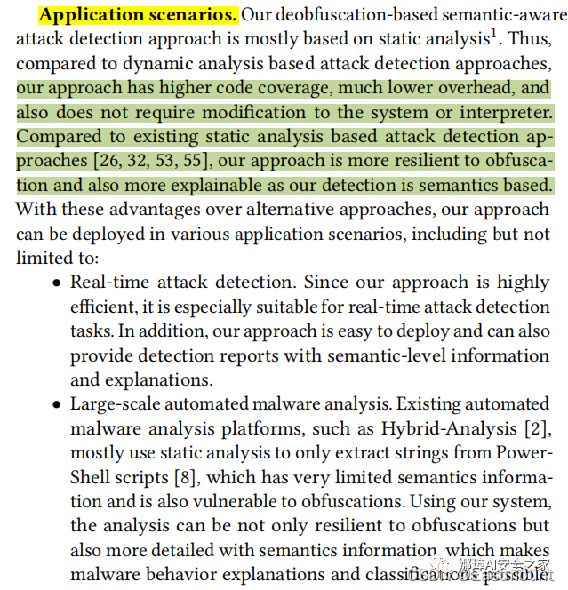 由于去混淆做得非常好,Powershell源码有丰富的语义,因此关于Powershell的恶意检测文章很少。最后,我们读论文,也需要看看未解决的问题、存在的困难或者下一步工作,作者说到了逃逸攻击,包括反调试、高价值攻击无法检测等,以及逻辑混淆。具体参见下图:
