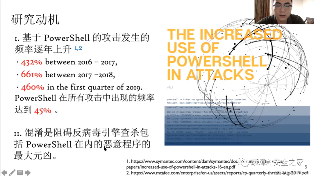 Powershell越来越多出现在各种攻击事件中,根据Mcafee和Symantec报告显示,在2016年至2019年期间,基于Powershell的攻击发生的频率逐年上升,占所有攻击中的45%。