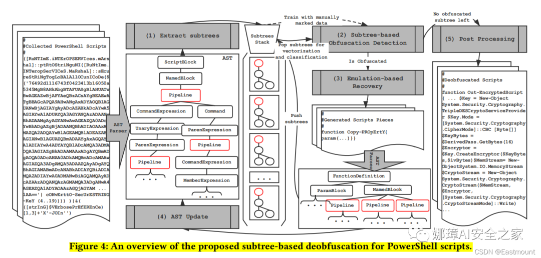 为了克服这一挑战,本文为 PowerShell 脚本设计了第一个有效且轻量级的反混淆方法。为了解决精确识别可恢复脚本片段的挑战,设计了一种新颖的基于子树的反混淆方法。该方法在 PowerShell 脚本的抽象语法树(Abstract Syntax Tree)中的子树级别执行混淆检测和基于仿真的恢复。