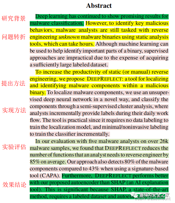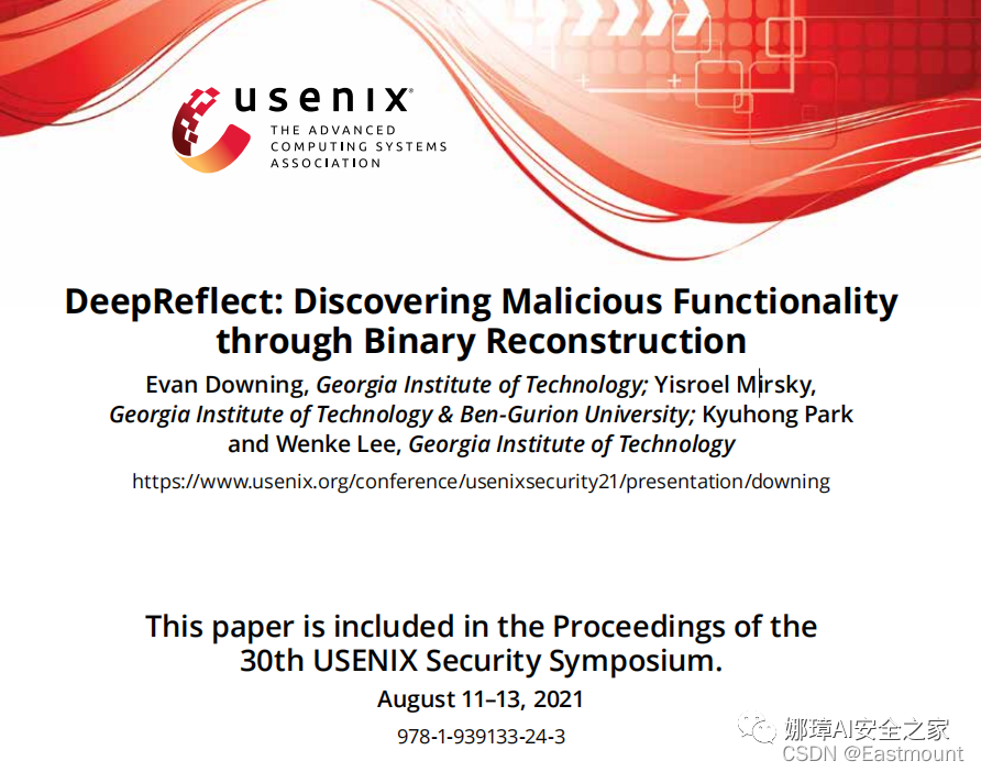 前一篇从个人角度介绍英文论文实验评估(Evaluation)的数据集、评价指标和环境设置如何撰写。这篇文章将带来USENIXSec21恶意代码分析的经典论文——DeepReflect,它通过二进制重构发现恶意功能,来自于佐治亚理工学院。希望这篇文章对您有所帮助,这些大佬是真的值得我们去学习,献上小弟的膝盖~fighting!同时文章末尾有我的论文感受和精句摘要,欢迎各位老师和博友批评指正。