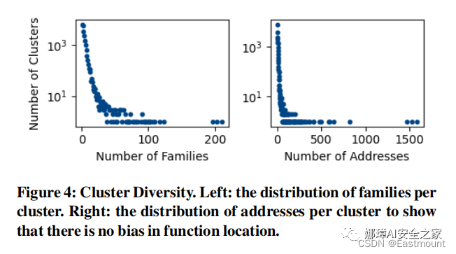 为了评估DeepReflect是否为恶意软件家族间的关系及其行为提供了有意义的见解,我们探索了集群多样性。图4的左侧绘制了C中每个类簇中不同家族的数量。由图可知,在家族之间有许多共享的恶意软件技术和变体,部分恶意软件家族间分享了相同的函数,新的恶意软件家族的样本也可以被成功的分类。